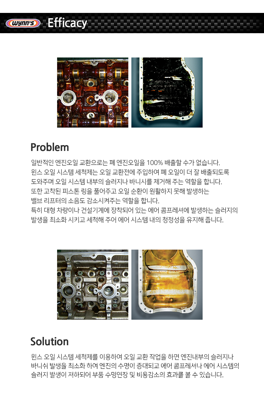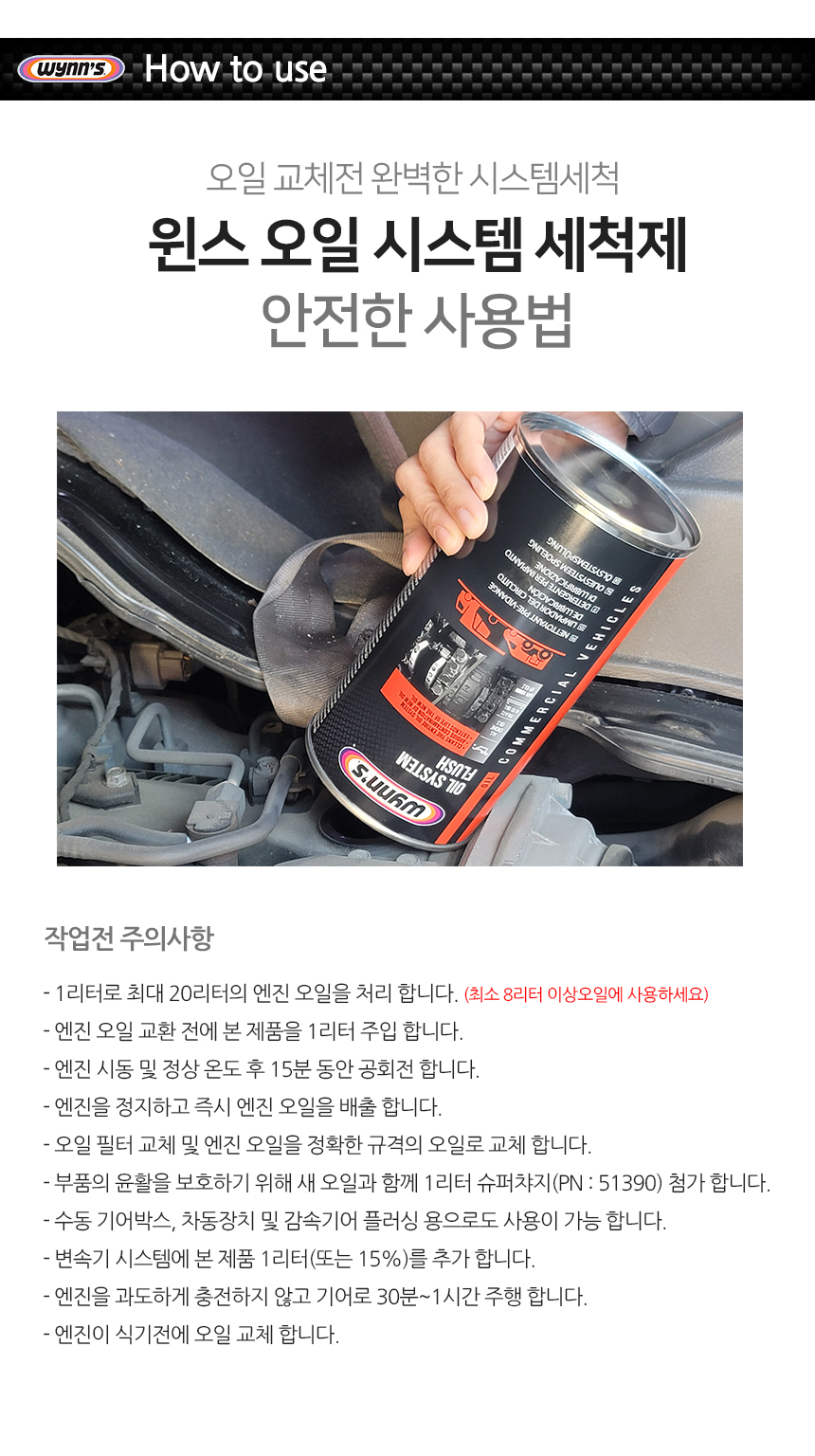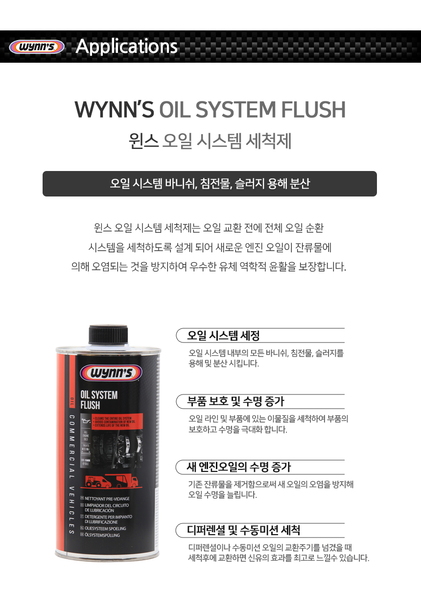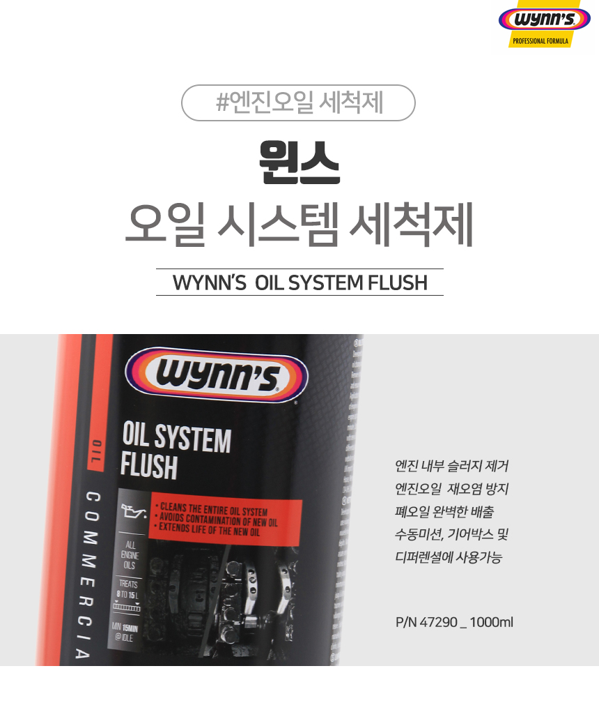 윈스 오일 시스템 세척제는 엔진 내의 슬러지나 바니쉬를 제거시켜 엔진의 출력 복원, 소음감소, 고장 예방과 함께 엔진 수명을 연장 시켜주는 제품입니다.